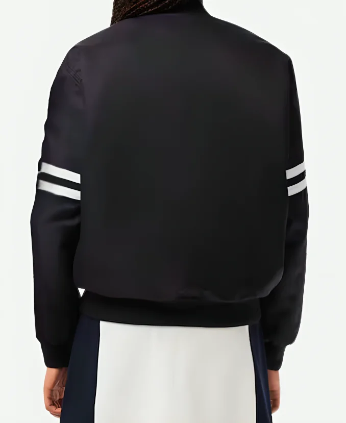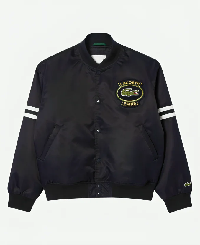 Lacoste Vintage Patch Black Satin Varsity Bomber Jacket For Sale