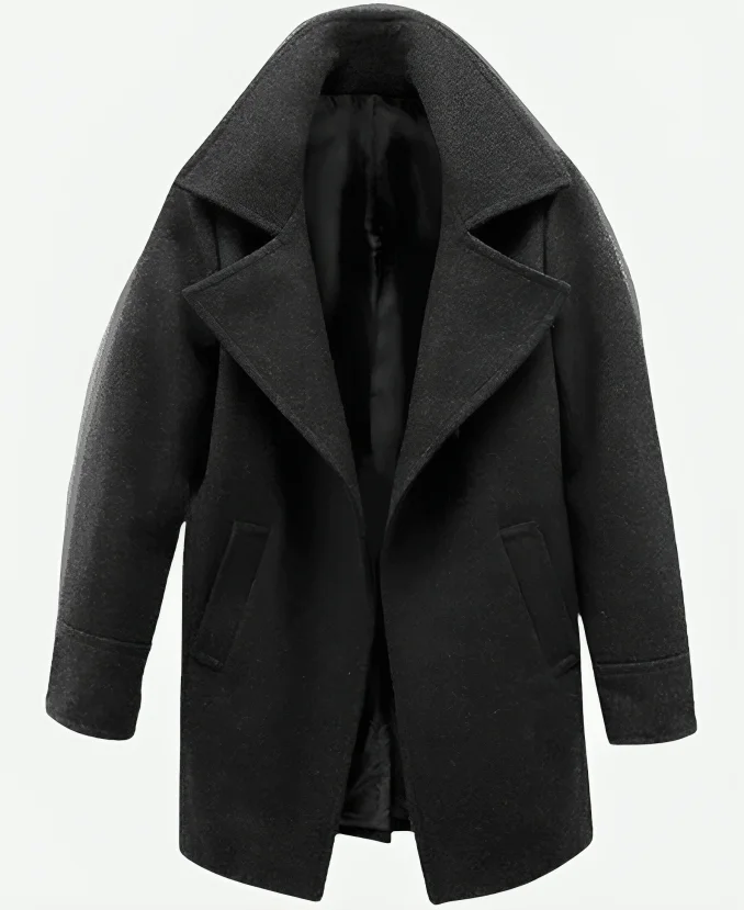 - Collar: Stand-up wide notch lapel style collar